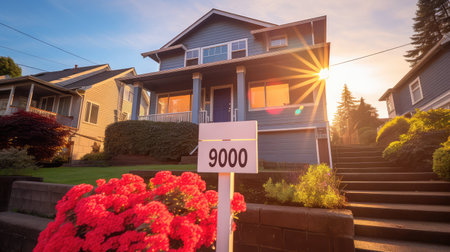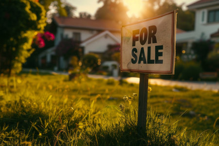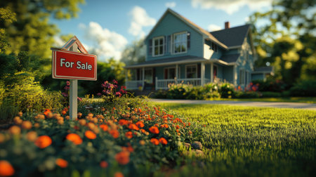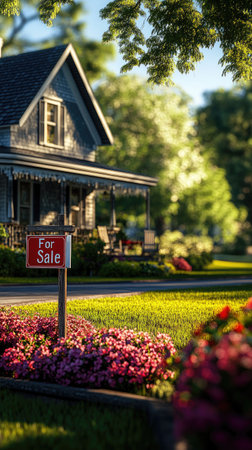 Charming house with for sale sign, bathed in the warm glow of sunset, embodies the American dream of homeownership