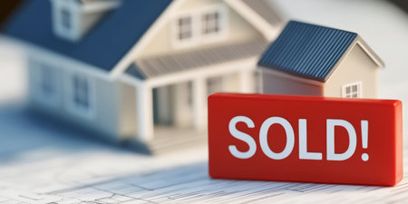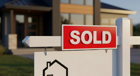 A close-up of a red 'SOLD' sign from a real estate agent, with a modern house blurred in the background. The sign is attached to a white post, signifying a successful property transaction.