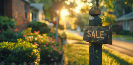 Wooden Sale sign in suburban home yard with sun setting, warm glow in foreground, home blurry in background.