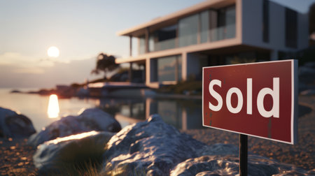 Sold sign in front of a waterfront property at sunrise. Scenic real estate sale concept.