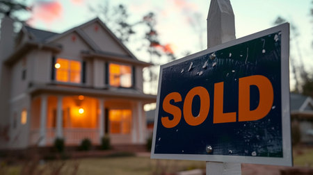 Sold Home For Sale Real Estate Sign In Front of House With Beautiful Sunset, For Sale Real Estate Sign in Front of New House. Real Estate Business Concept, AI Generated