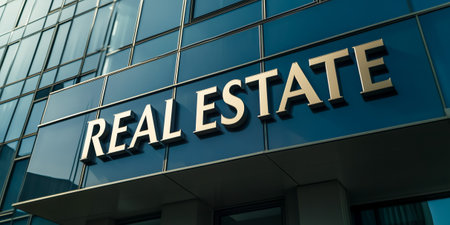 A close-up of a modern building featuring a prominent real estate sign on the facade