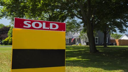 Sold sign in front of a house in a residential neighborhood in summer. Copy space for text