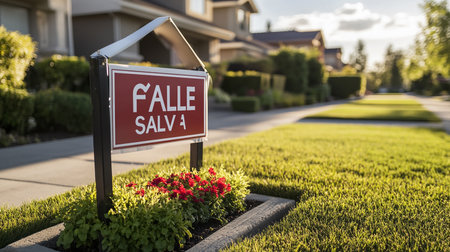 A sale sign in bright yellow, attracting attention in residential area, surrounded by greenery and homes, creating welcoming atmosphere