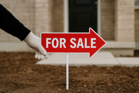 Red for sale sign with arrow and gloved hand in front of house entrance, indicating real estate availability and property listing.