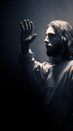 jesus standing in front of a dark background