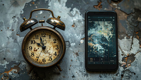 A weathered vintage alarm clock rests beside a sleek modern smartphone on a textured, rustic surface.