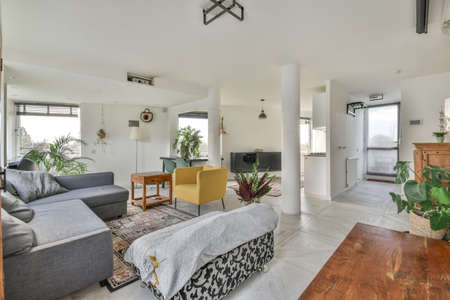 Armchair and sofa located in light room of spacious contemporary apartment near kitchen