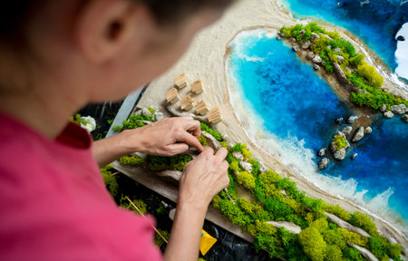 Artwork in process. Artist talent and style. Relief pattern canvas on floor. Woman with brush.