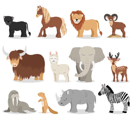 Vector illustration with wild animals in the jungle on white background. Flat style.
