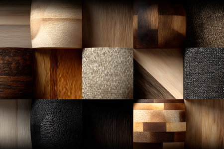 Diverse material samples wood, fabric, tiles, leather for modern home decor.