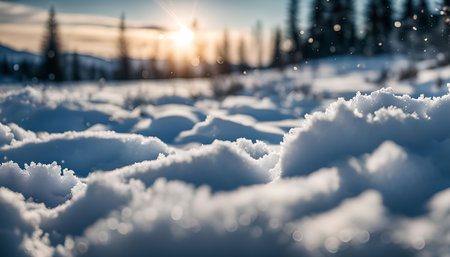 A close-up of a snow-covered landscape with a sun shining through the trees in the background. The snow is fluffy and white, and the sun creates a warm glow over the scene.
