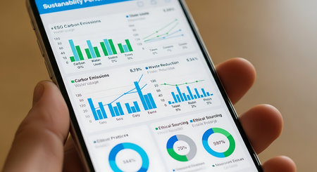 a smartphone in hand showing sustainability data with carbon emissions and waste reduction charts