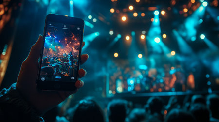 Sharing Concert Experience Smartphone Recording Live Music Performance Under Vibrant Stage Lights