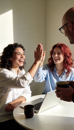 Joyful team of diverse colleagues celebrating a successful project. Two women give a high five over a laptop while a man smiles, showing teamwork and achievement in a modern workplace.