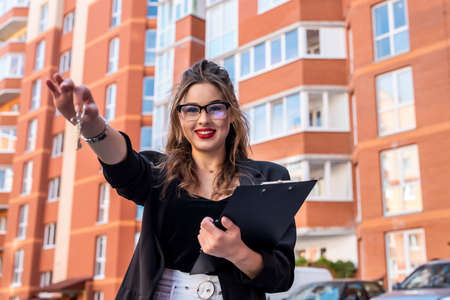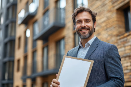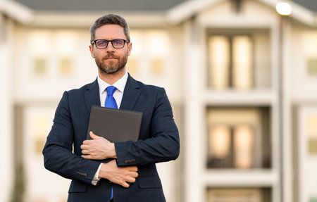 Young professional realtor is standing in the street, holding a contract for a new apartment building