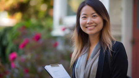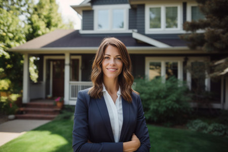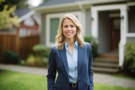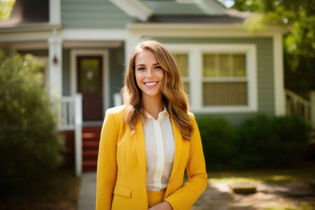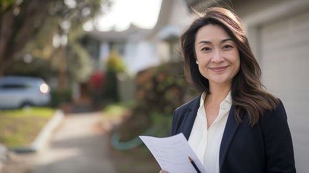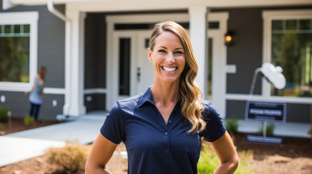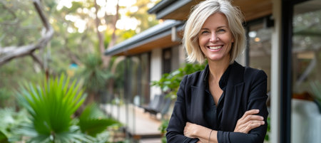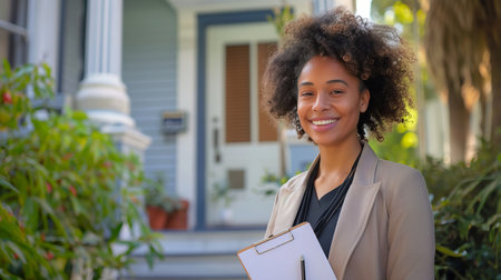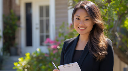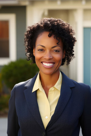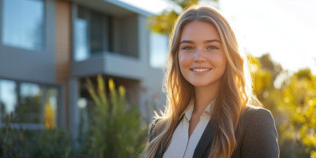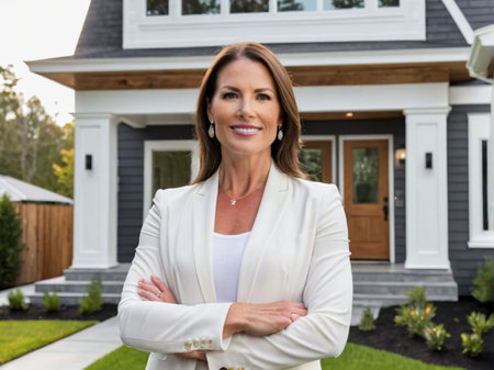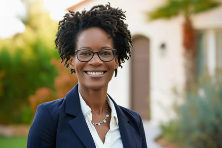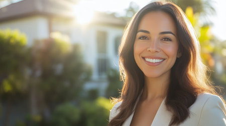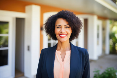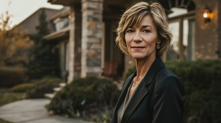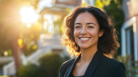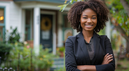 A professional woman stands confidently at her home, showcasing a smile and welcoming demeanor on a sunny day