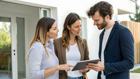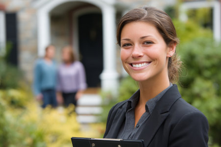 A real estate agent wears a black suit and holds a clipboard while standing in front of a home. Two clients are visible behind her, discussing their options in a pleasant, sunny setting.