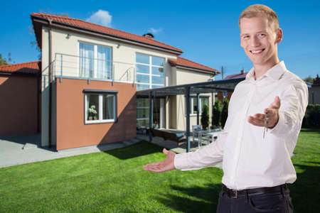 Real estate agent at house for sale. Realtor in suit. Rent or buy new home. Home insure. Property insurance promotion. Successful broker. Mortgage insurer. American sales manager