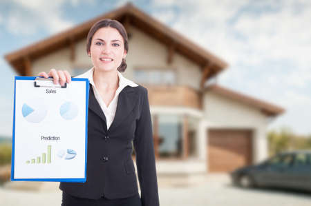 Estate profit concept with female realtor standing outdoors with clipboard with diagrams in hand and advertising area
