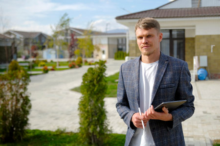 A real estate insurer. Portrait of a realtor or sales manager. A confident, successful, handsome man in a suit with a tablet and a stylus in his hands stands in front of a country house. Summer
