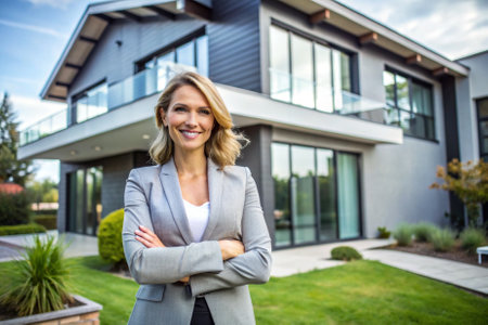 woman in business suit standing in front of house after signing a contrac.