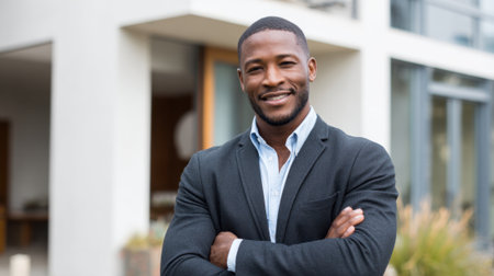 Real estate agent is standing in front of a house with his arms crossed, smiling