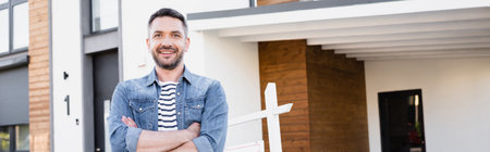 Happy man with crossed arms looking at camera near house, banner