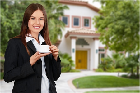 woman in business suit standing in front of house after signing a contract.