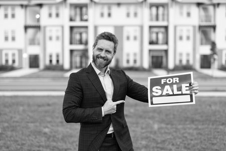 photo of broker with for sale board, point finger. sale property by broker. man broker