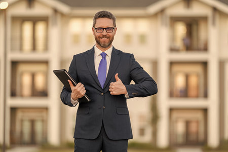 Successful broker. Mortgage insurer. Sales manager. Real estate agent at house for sale. Realtor in suit. Rent or buy new home. Home insure. Property insurance promotion. Thumb up