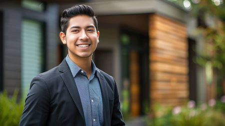 The picture of hispanic real estate man with confident is standing outside near the building, the real estate require skill marketing, negotiation, communication, experience, legal knowledge. AIG43.