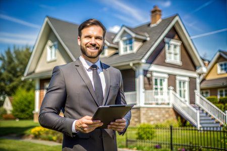 A real estate agent standing confidently outside a residential property, indicating expertise in home sales.