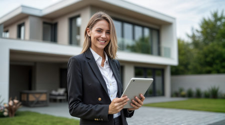 A female realtor in a business suit holds a tablet in front of a large house. She smiles and looks happy.