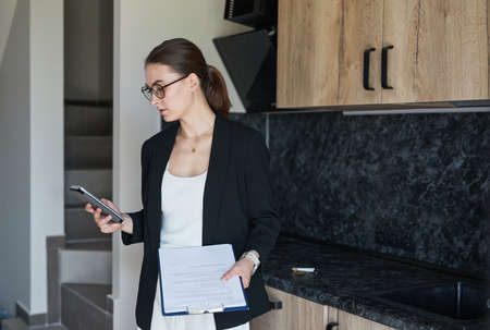 Graphic portrait of female real estate agent using smartphone while standing by kitchen in house for sale, copy space