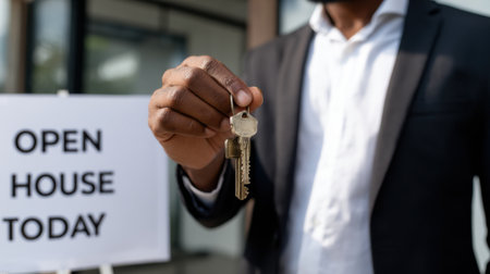 A man is holding a key in front of a sign that says Open House Today. Concept of excitement and anticipation for the upcoming open house event