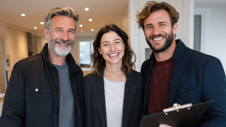 Confident real estate agent assisting potential house buyers outside modern home