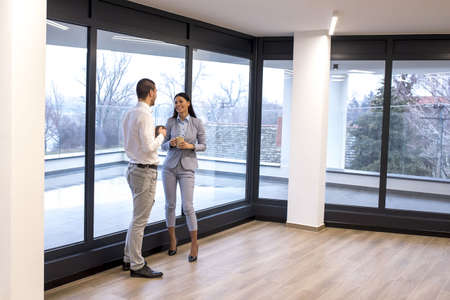 Realtor giving future tenants or first time buyers tour about modern apartment. Boyfriend and girlfriend or husband and wife planning to buy new home and meeting with real estate agent in new house