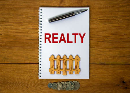 White note with inscription 'realty' on beautiful wooden table, metalic pen and miniature wooden fence. Business concept.