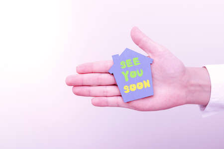 Hand writing sign See You Soon. Business overview used for saying goodbye to someone and going to meet again soon A Young Lady Businesswoman Holding Presenting Home In Business Outfit