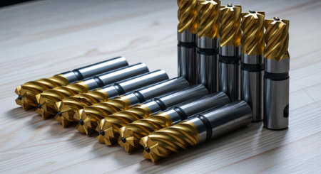 Nine high detail metal milling cutters with golden flutes and silver shanks arranged on a light wooden surface. tools for precision machining and industrial applications.