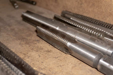 Used drill bits on metal close-up. Set of steel drills in lathe workshop. Background.