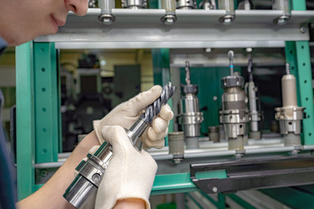 A worker inspects and selects a cutter from a rack to use on a CNC machine.