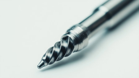 Detailed close-up of a metal drill bit showcasing its helical twist and sharp cutting edges, ideal for industrial applications and engineering projects.
