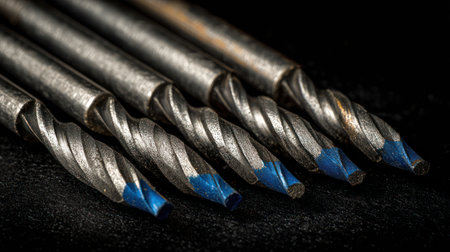 This close-up image showcases several metal drill bits arranged on a dark backdrop. The tools feature a spiral design and have blue accents at their tips. The lighting highlights the metallic texture. This image could be used for various commercial projects related to tools and hardware.