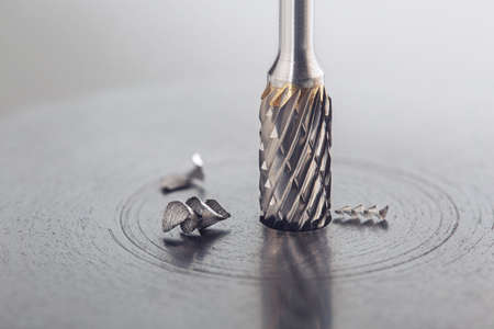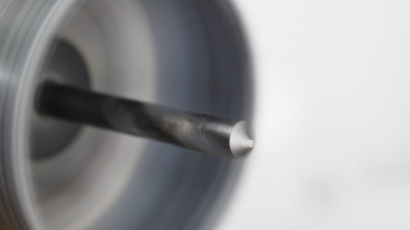 Close up of metal drill bit tip hovering above a surface.