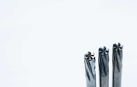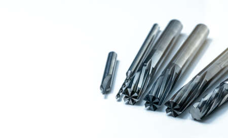 Special tools isolated on white background. Solid carbide end mill cutting tools by CNC milling cutter. Coated step drill. Cemented carbide. Carbide drilling tool for industrial applications.