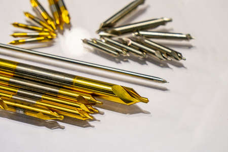 The group of various size of center drill on the white floor. The hi-speed cutting tool for hole processing.