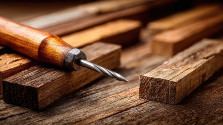 A close-up view of a woodworking tool resting on rustic wooden boards, showcasing the intricate details of craftsmanship and the beauty of handmade techniques.