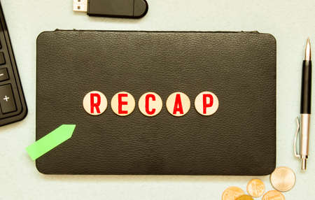 word Recap made with wood blocks. text is written in black letters, light background, business concept